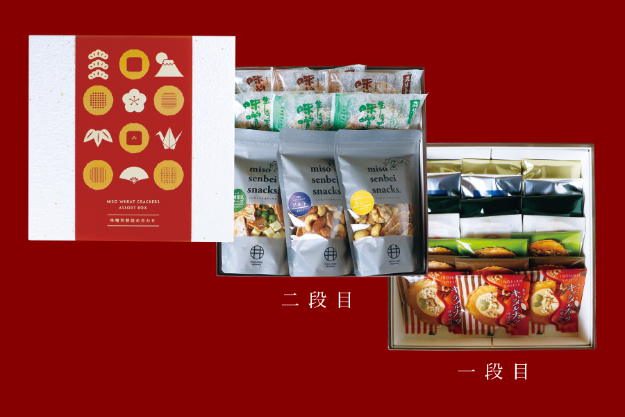 - 今年のお重箱は、新商品!ミソセンベイスナックス3種類が入ったスペシャルな内容になっています。その他定番の味噌煎餅から季節限定のキャラメルナッツの味が入っています。年の瀬の贈り物におすすめです♪