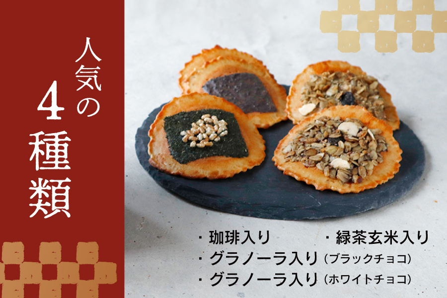 - ちょこっと珈琲入り味噌煎餅、野草グラノーラ入り味噌煎餅(ブラックチョコ、ホワイトチョコ)、ちょこっと緑茶玄米入り味噌煎餅の計4種類の味噌煎餅が入ったバラエティーセットです。食べ比べやプチギフトに最適です!見た目もかわいいキューブ型の箱でお届けします。