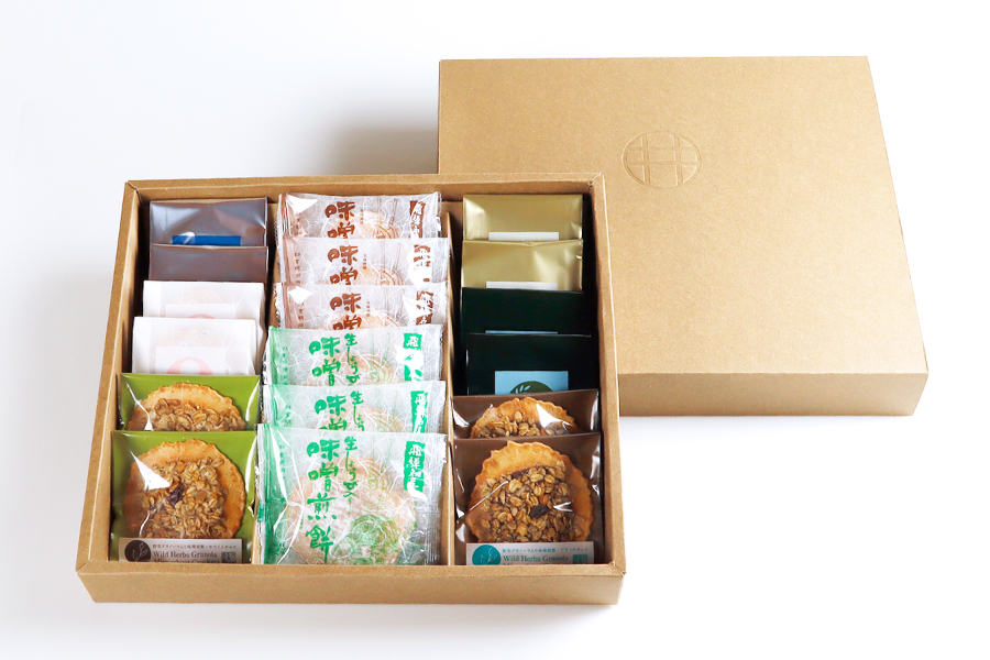 | 内容量 | 味噌煎餅(2枚×3袋)、生しょうが入り(2枚×3袋)、珈琲入り(2枚×2袋)、えごま入り(1枚×2袋)、緑茶玄米入り(1枚×2袋)、酒かす入り(2枚×2袋)、グラノーラ(ブラック:1枚×2袋、ホワイト:1枚×2袋) |